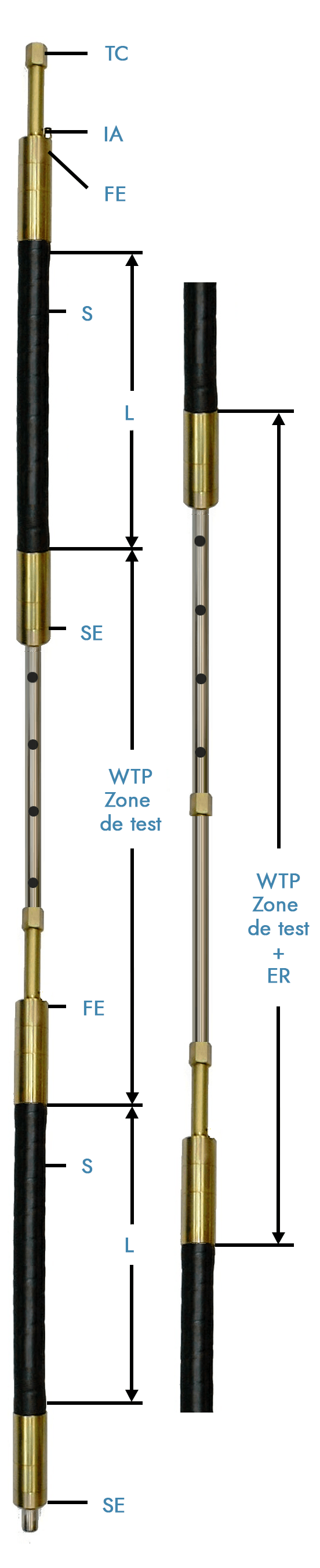 La parte superior esta equipada de un adaptador de inflado IA situado sobre el término fijo superior FE. El tubo del obturador superior esta perforado en su parte baja. Las pruebas se realizan por medio de inyecciones de agua al suelo a través de éste tubo.