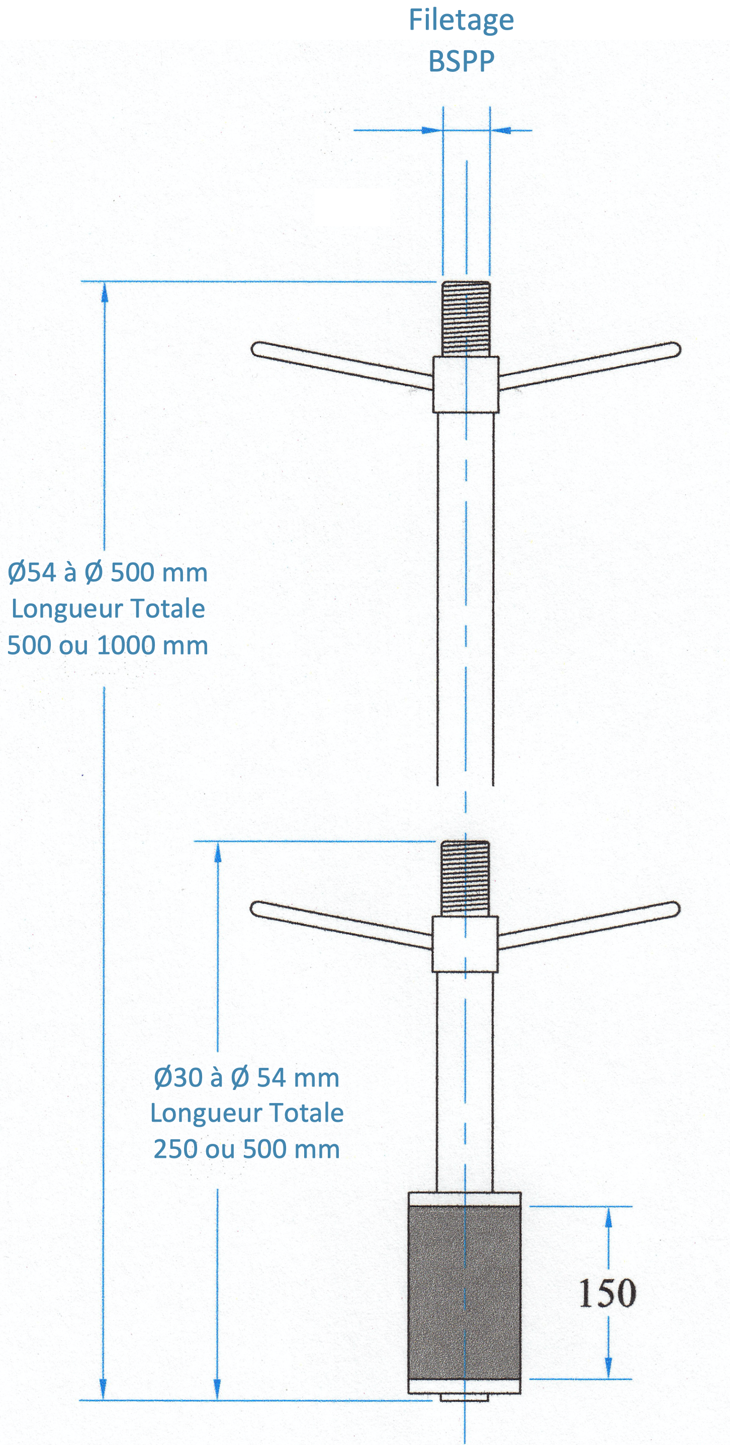 | Type Ø | Longueur caoutchouc | Longueur totale | Ø Tube et Filetage |