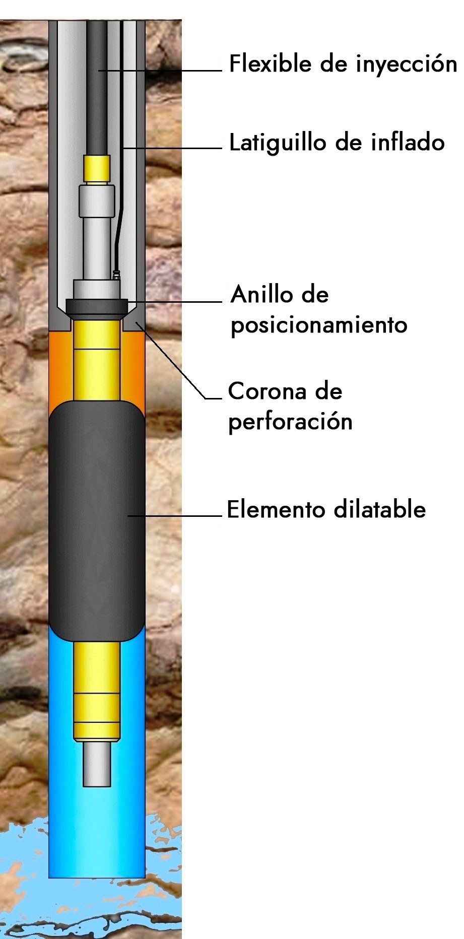 Para realizar pruebas de permeabilidad a medida que el sondeo avanza a baja profundidad, los obturadores se pueden equipar de un anillo de posicionamiento el cual se va a sentar por el interior de la corona de perforación. La inyección se realiza a través de un flexible de inyección.